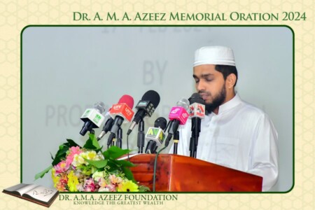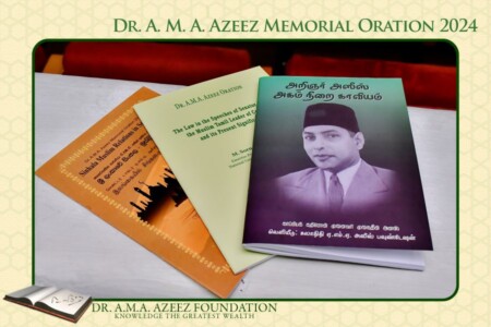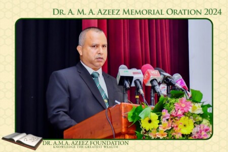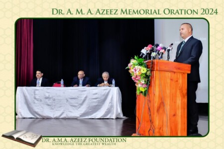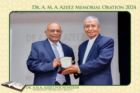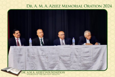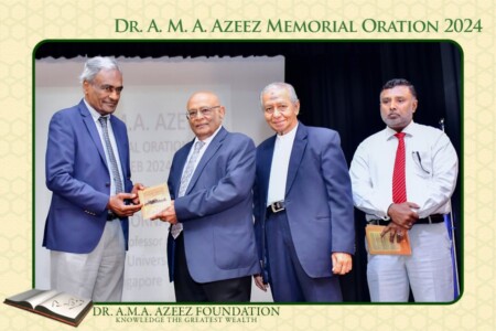 In concluding his oration, Prof. Sornarajah pays a high tribute to Dr. Azeez by saying, “In Tamil, the perfection of a man and a woman are enshrined in the concept of a perfection possessed by a person called a சான்றோன். ஈன்ற பொழுதின் பெரிதுவக்கும் தன் மகனைச் சான்றோன் எனக்கேட்ட தாய். The Tamil Poet, Thiruvalluvar indicates the extent of this perfection by saying that the joy of a mother is greater when she hears her son being called a சான்றோன் than the joy at the time of his birth. In my estimation, by learning, conduct, his sacrifice of powerful positions to serve his people as an educator, his fearlessness in espousing unpopular views and the power of oratory in both English and Tamil qualify him to be regarded as an exceptional figure in the history of this country. It is an honour for me to have spoken of such a man”.