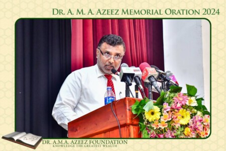 At the outset he says, “- – My father, who did not want my horizon to be limited to his own person as a mid-level public servant, told me that I should look to Senator Azeez as my model, for he was a fellow Jaffna man, a product of a Hindu College like him, a scholar in Tamil, steeped in the knowledge of Hindu texts but also the pre-eminent leader of the Muslims – -“. He commented on the speeches of Senator Azeez and uses his vision to present a picture of what ails Sri Lanka today. In particular he analyses extensively on Senator Azeez’s foresight in his longest and most brilliant speech in opposing the Sinhala Only Bill. He uses the hybrid term to refer to Dr. Azeez as a Muslim Tamil Leader by clarifying, “He was an undoubted leader of the Muslim community. Without a shadow of doubt, he had all the vestiges, in scholarship of Tamil and Tamil Saivaism and Tamil literature to be quintessentially fit to be a Tamil leader, surpassing other Tamil leaders of his times in the attributes of greatness that a Tamil leader should have”.